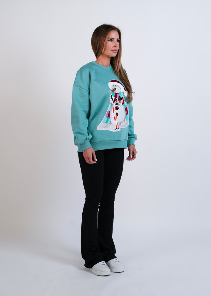 Tohle je nejstylovější sněhulák sezóny – s candy hůlkou, proužkovanou šálou a výraznou 3D výšivkou, která dělá z celé mikiny absolutní vánoční must-have.